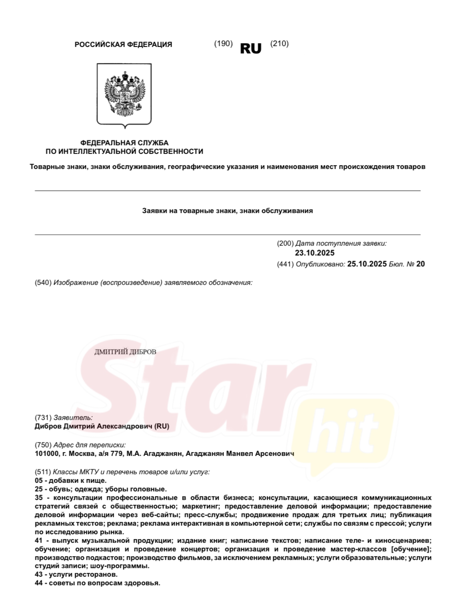 Также в перечень услуг, которые шоумен хочет закрепить за собой, попали «добавки к пище», «обувь, одежда и головные уборы», «выпуск музыкальной продукции, издание книг», «написание теле- и киносценариев, орагнизация и проведение концертов», «услуги ресторанов», «советы по вопросам здоровья».