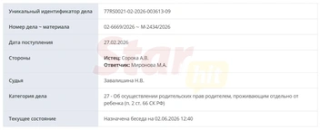 В феврале 2026 года Андрей снова подал в суд на Марию — на этот раз мужчина заявил о том, что сам ограничен в общении с 6-летним сыном. Статья поменялась на 66-ю — теперь речь идет «об осуществлении родительских прав родителем, проживающим отдельно от ребенка». В частности, отец хочет иметь возможность общаться с мальчиком и участвовать в его воспитании, чему, судя по всему, препятствует Миронова.