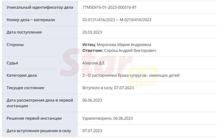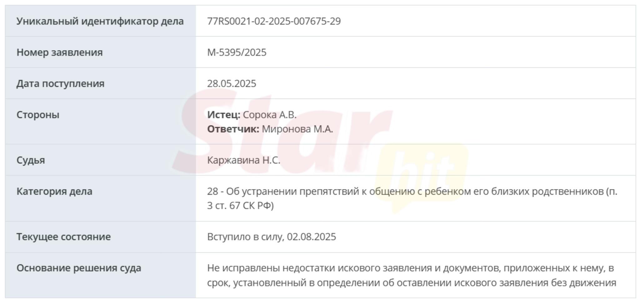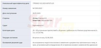 Однако спустя три года все изменилось. Сорока трижды обращался с иском к Мироновой в Пресненский суд Москвы. Сначала в категории дела значилась 67 статья, где он просил «об устранении препятствий к общению с ребенком его близких родственников». Похоже, что речь шла о дедушках и бабушках маленького Федора. Но в принятии иска все три раза было отказано из-за допущенных ошибок в составлении заявления и не соблюдения требований гражданского процессуального кодекса.