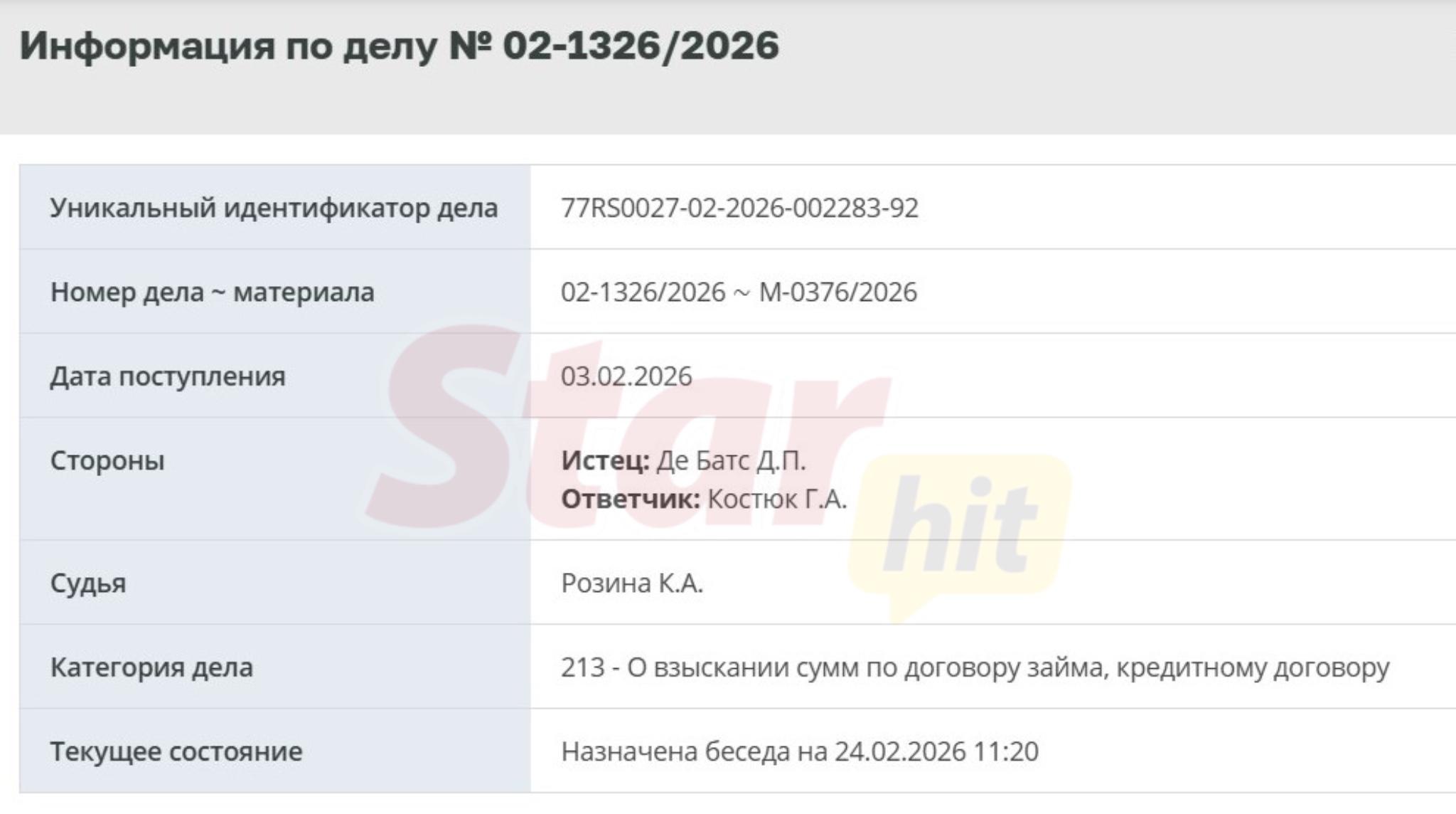 Впоследствии часть Костюк все-таки вернул, но пропал, оставшись должен значительную сумму. Устав бегать за звездным семейством, Дарья решила перевести вопрос в правовое русло. 3-го февраля Тверской районный суд Москвы зарегистрировал ее иск «о взыскании сумм по договору займа». Беседа между представителями сторон назначена на 24 февраля.
