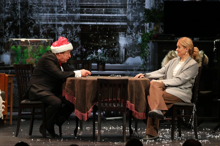 Спектакль начинается в кромешной темноте — на сцене спиной к залу Он. Сразу становится понятно, что пьеса и фильм 1983 года адаптирована под наши дни, потому что… Он записывает «кружок»! Она появляется несколькими минутами позже и падает в обморок от неожиданности. Еще бы, увидеть бывшего мужа, да еще и в костюме Дедушки Мороза, в собственной квартире спустя столько лет.
