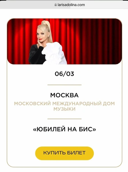Концерт «Юбилей на бис», приуроченный к 70-летию Ларисы Александровны уже переносился один раз — изначально он должен был состояться в конце 2025 года. Но билеты не раскупили, организаторы выбрали новую дату — 6 марта. «Вас ждет праздничная версия концерта в преддверии Международного женского дня», — так анонсировала шоу Долина в своих соцсетях.