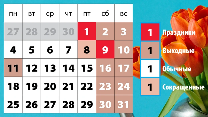 На этом сюрпризы не заканчиваются. Спустя несколько дней нас ждут выходные, приуроченные ко Дню Победы. В 2026 году 9 мая выпадает на субботу, поэтому выходной переносится на понедельник. В итоге второй праздничный блок продлится также три дня — с 9 по 11 мая. Пятница, 8 мая, будет сокращенным рабочим днем.