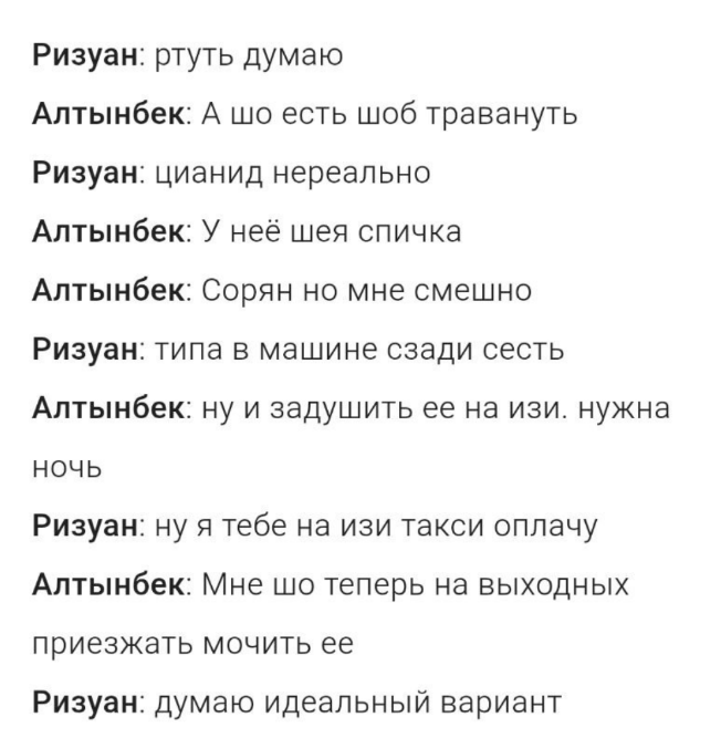 «Дима (между собой они называли так Яну) делает мне мозги. Предлагай варианты. Диму убрать надо. Как бы это тупо ни звучало. Она пробьет номер интерцептора (той самой другой девушки Ризуана) и начнет про меня вонять. Ну, прям убрать думаю. Так спокойнее будет. Как бы я один не справлюсь. Пойдешь на такое со мной?» — писал Ризуан.