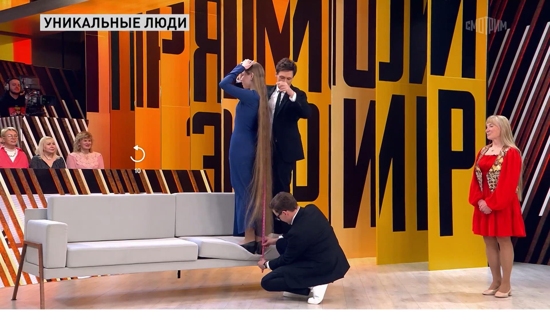 Особый интерес в студии «Прямого эфира» вызвала и 18-летняя Арина Саяпова, похваставшаяся волосами в 197 сантиметров. Девушка говорит, что ей с детства нравился мультик «Рапунцель», поэтому она решила отращивать косу. «У мамы такого желания не было. Я впервые сама помыла голову в 16 лет, потому что раньше помогали родители. Коса была бы еще больше, но несколько лет назад пес отгрыз 40 сантиметров», — с улыбкой сказала девушка.