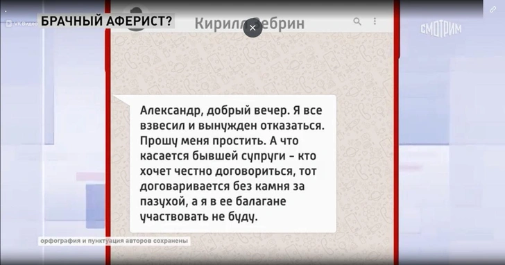 «Если она намерена устроить цирк, это ее личное дело. Я в этом участвовать не собираюсь. Ребенок не окажется на улице, вы просто всего не знаете. А вам она врет и рассказывает то, что ей нужно. У нее все есть — и деньги, и все остальное. Не старайтесь меня разговорить. Я все платил, никаких долгов по алиментам у меня нет. Эта женщина врет, чтобы добиться своего — хочет оставить себе эту квартиру», — резюмировал Кирилл Зебрин.