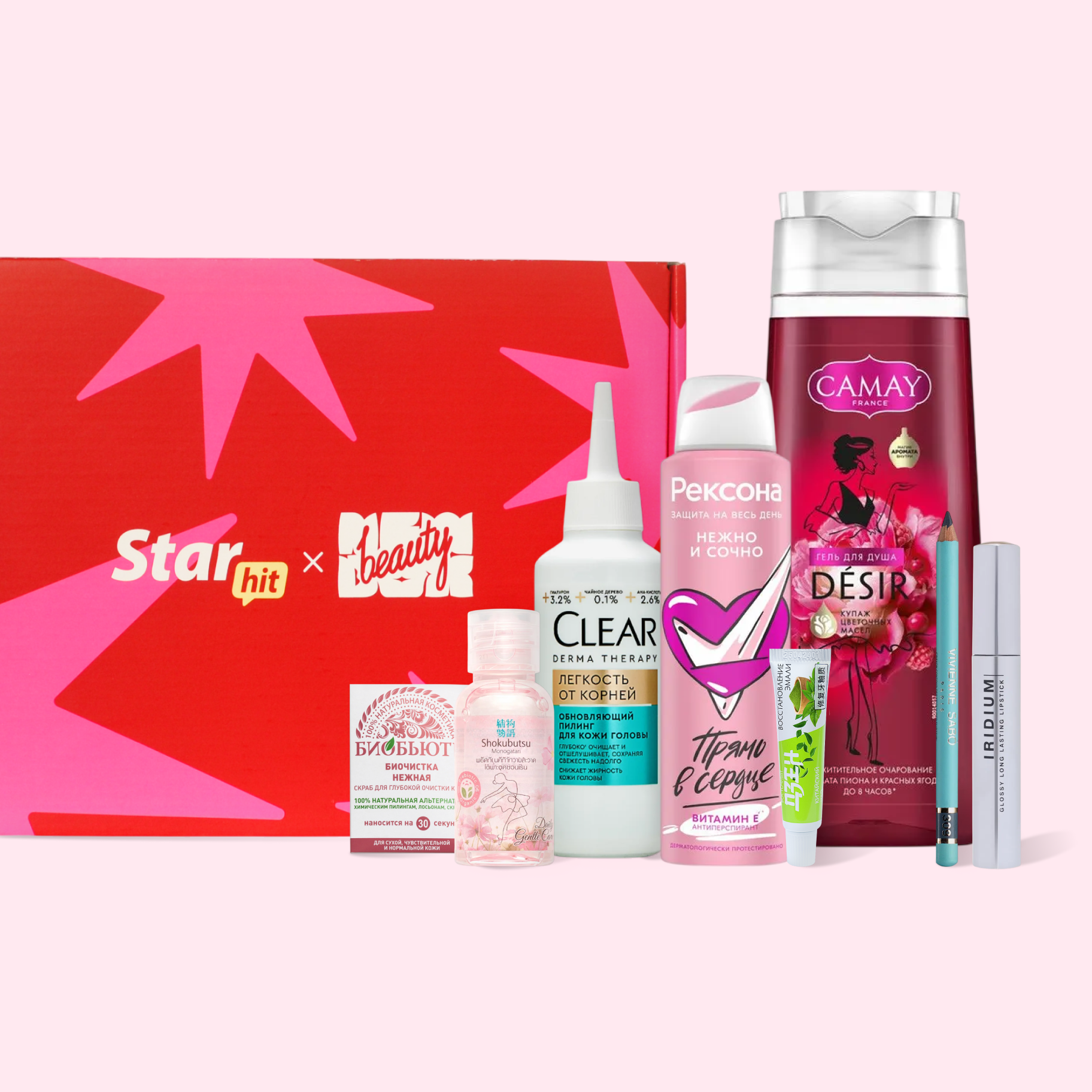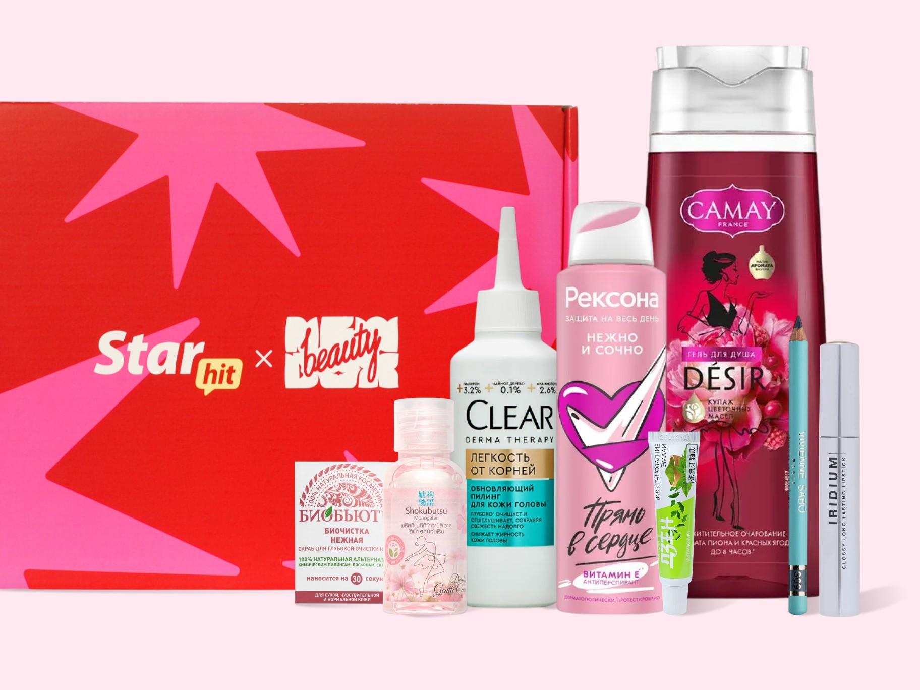 В состав коробочки вошли продукты для тела и макияжа, помогающие переключиться: гель для душа Camay с нотами пиона и ягод, мягкий гоммаж БиоБьюти для обновления кожи, антиперспирант Rexona с фруктовым ароматом. Образ дополнят декоративные акценты — глянцевая помада Influence Beauty и карандаш для век Vivienne Sabo в сине-сером оттенке.