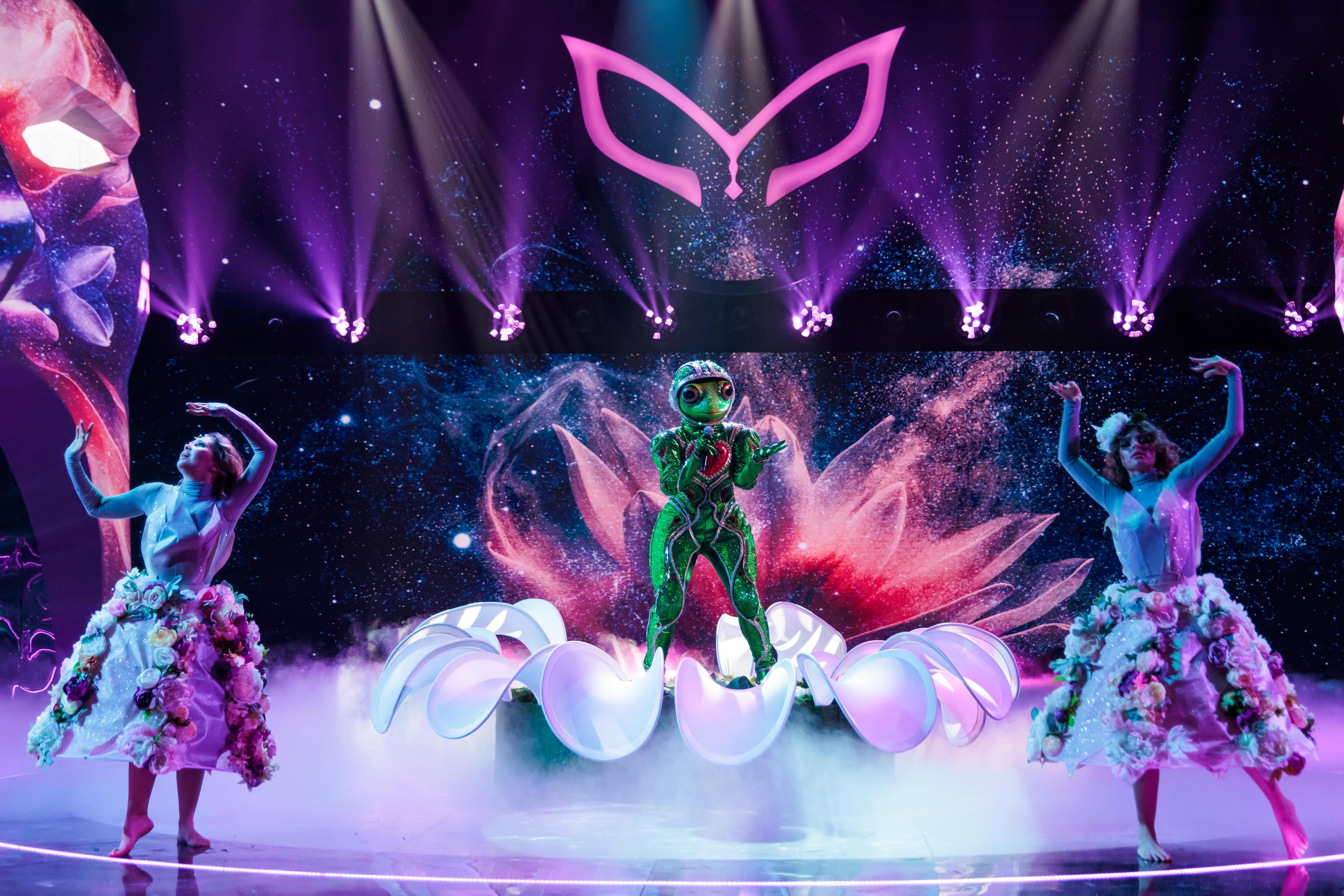 Очаровательная Лягушка вышла на сцену с фото юного Филиппа Киркорова и подарила поп-королю свою миниатюрную копию. Третий выпуск для председателя жюри оказался очень прибыльным. Лягушка исполнила легендарную песню «Трава у дома» коллектива «Земляне», чем впечатлила Валерию. «Невероятное галактическое путешествие», — восторгалась артистка. Под зеленой маской искали Ольгу Зарубину и Юлию Пересильд.