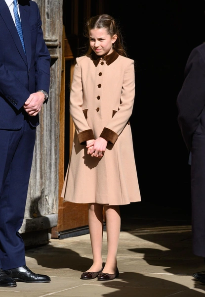 Ее юная дочь выглядела не менее очаровательно и аристократично. Девочка появилась на публике в сшитом на заказ бежевом платье-пальто от Catherine Walker с отделкой цвета мокко — точь-в-точь таком же, в котором ее уже видели на рождественских торжествах в прошлом году.