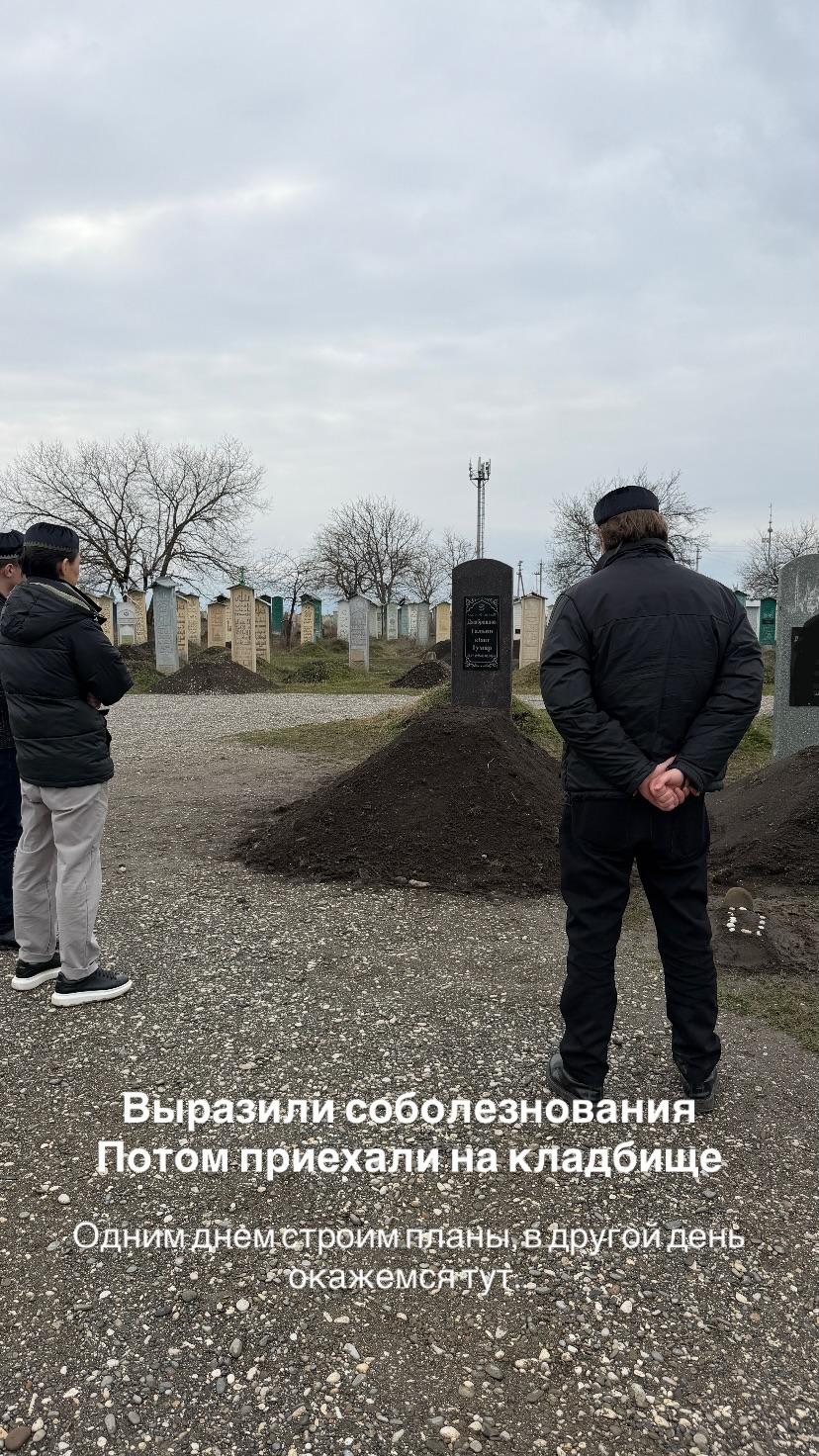 На похоронах Умара Джабраилова присутствовали десятки человек. Поток желающих проститься с ним по-прежнему не иссякает. Сегодня к могиле бизнесмена приехала группа молодых людей, которые занимались его продвижением в соцсетях. Они показали, как выглядит последнее пристанище Умара Джабраилова. На черной надгробной плите выгравированы имя покойного на родном языке, а также даты рождения и смерти.