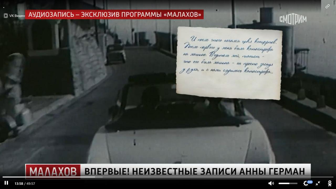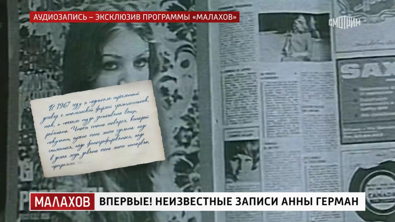 Эти записи и нашел Иван Ильичев, самый известный биограф Анны Герман. Он побывал дома у певицы, получил разрешение исследовать шкафы в ее комнате — там обнаружил прядь волос певицы, а также тайные записи артистки, которые привез в Россию и предоставил Андрею Малахову. Есть распоряжении биографа и дневниковые записи, где Герман рассказывала о жизни, любви и творчестве.