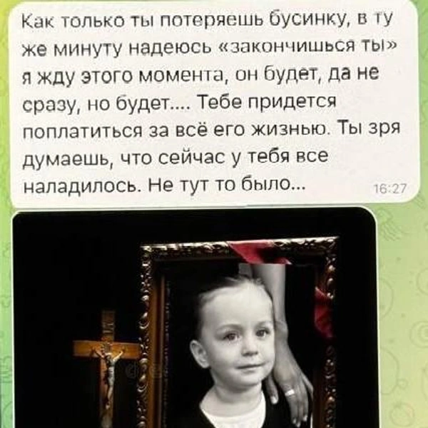 «Как только потеряешь бусинку, в ту же минуту, надеюсь, закончишься и ты. Я жду этого момента. Он будет, да не сразу, но будет… Тебе придется поплатиться за все его жизнью. Ты зря думаешь, что у тебя все наладилось. Не тут-то было…» — писала неизвестная.