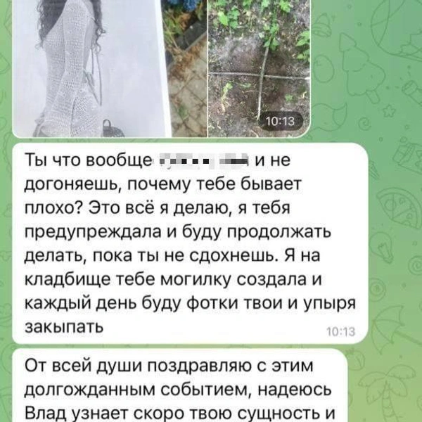 Сообщения поступают от имени некой женщины. Так, незадолго до свадьбы звезд она прислала Ангелине кадр, на котором закапывает ее фотографию на кладбище. Но самое страшное — зловещие обряды над снимками маленького Дэвида.