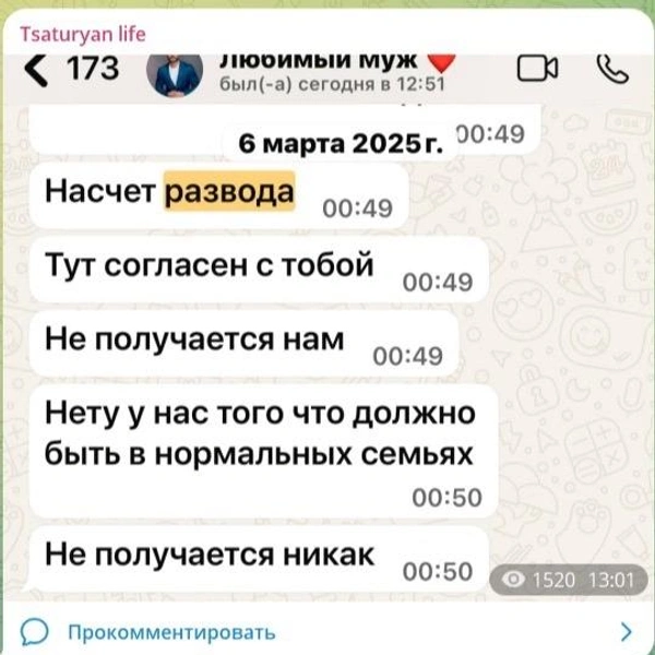 Спустя время Цатурян все же намекнула на причину расставания в своем Telegram-канале, опубликовав скрины переписки с супругом. На представленных кадрах Руслан жалуется, что нормальная семья у них не получается…