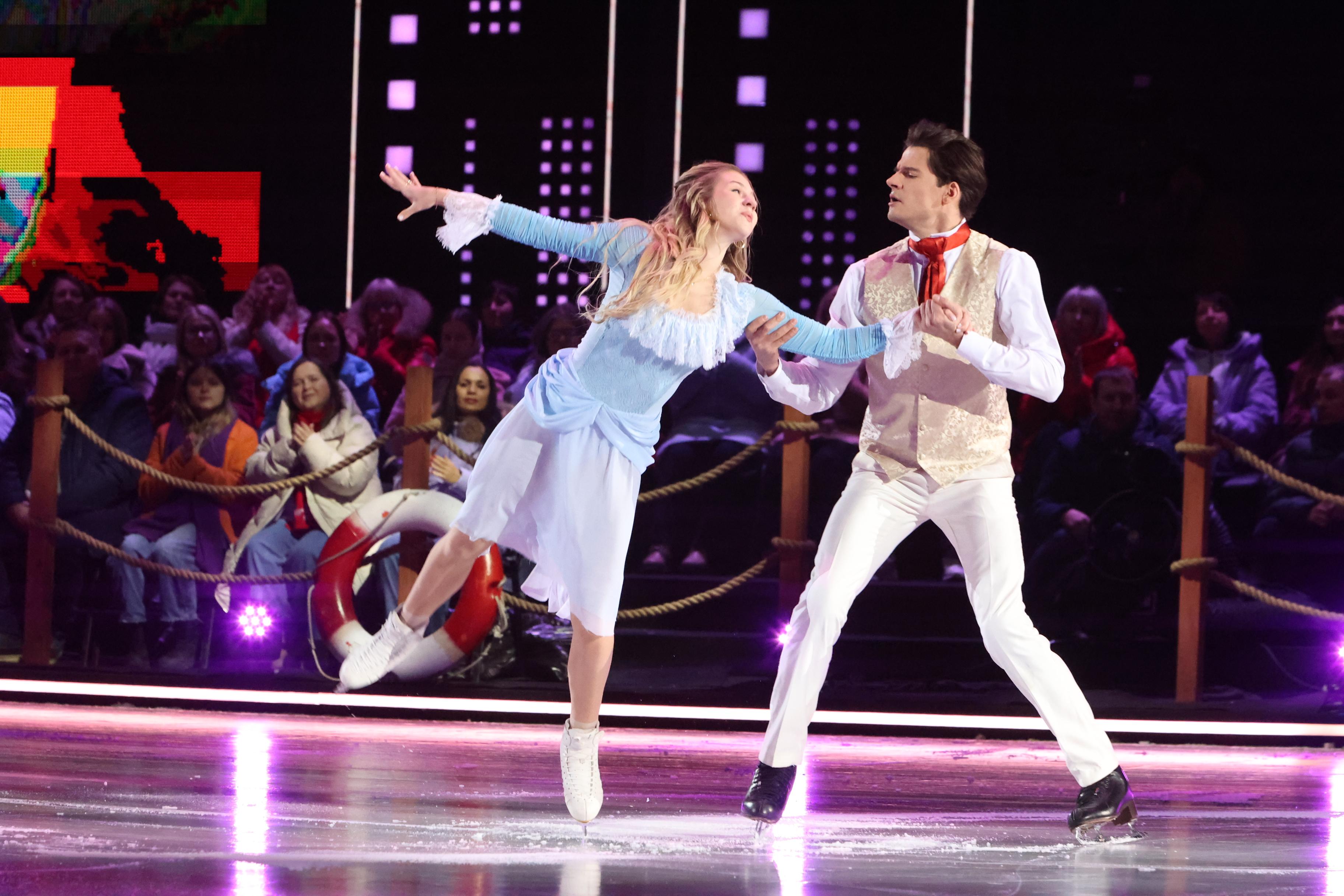 Первыми на лед вышли Александра Трусова и Иван Жвакин. Пара выбрала фильм «Жестокий романс» и выступила под песню «Любовь — волшебная страна».