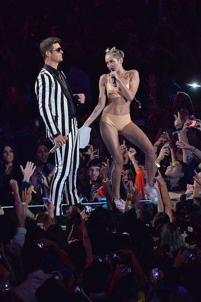 Певица сменила менеджера, выпустила успешный сингл We Can’t Stop, а затем шокировала публику выступлением с Робином Тиком на MTV Video Music Awards. Ролик, где артистка снимает на сцене боди и танцует тверк в нижнем белье, стал самым обсуждаемым в истории премии — за одну минуту 307 тысяч пользователей отреагировали на него в Сети.