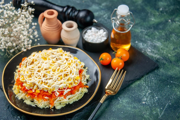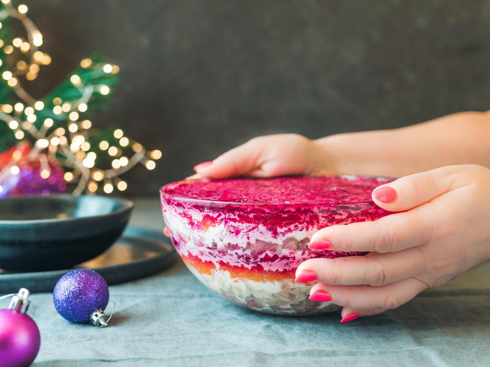Еще один салат, давно ставший символом домашнего праздничного застолья. Он прост в приготовлении и идеально гармонирует с остальными новогодними блюдами, так что советуем найти силы на приготовление этого товарища.