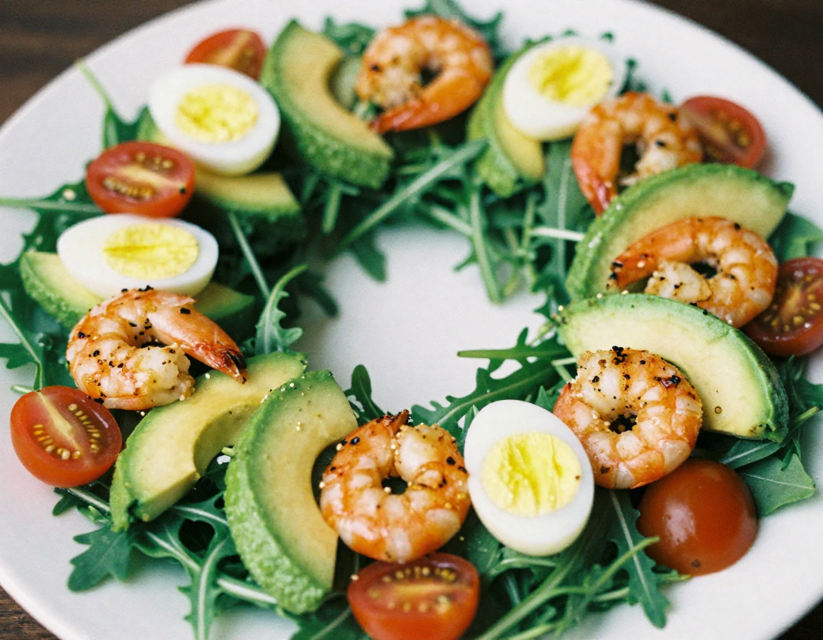 Разложите по всему периметру креветки, яйца и овощи. Представьте, что украшаете настоящий еловый венок, а ингредиенты в ваших руках — красивые новогодние игрушки.