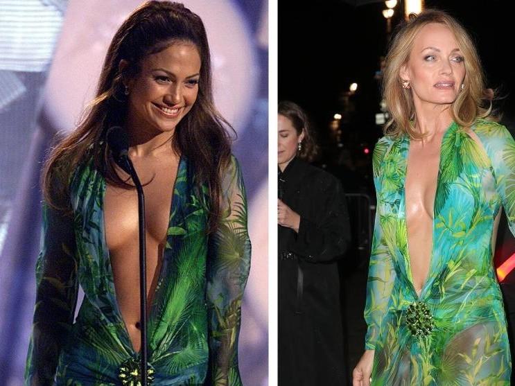 Яркое зеленое платье от Versace с принтом джунглей впечатлило множество мировых звезд. В том числе в этом наряде на красных дорожках и светских мероприятиях блистали певица с эффектными формами Дженнифер Лопес, обворожительная и стройная топ-модель Амбер Валетта. Его примеряла на себя и легенда мира моды Донателла Версаче.