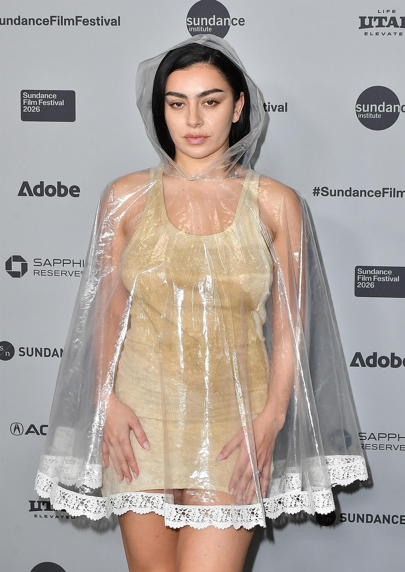 Чего нельзя сказать о популярной нынче поп-исполнительнице Charli XCX (настоящее имя — Шарлотта Эмма Эйтчисон), которая для публичного выхода выбрала подобрала смелый и необычный наряд. Певица примерила на себя экстремально короткое платье и прозрачный дождевик с кружевами по нижнему краю.