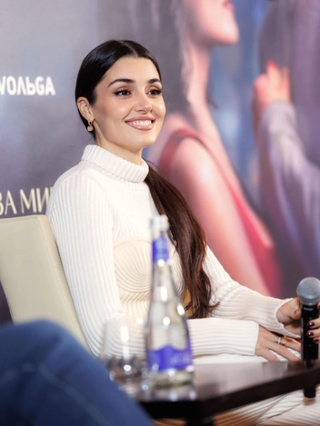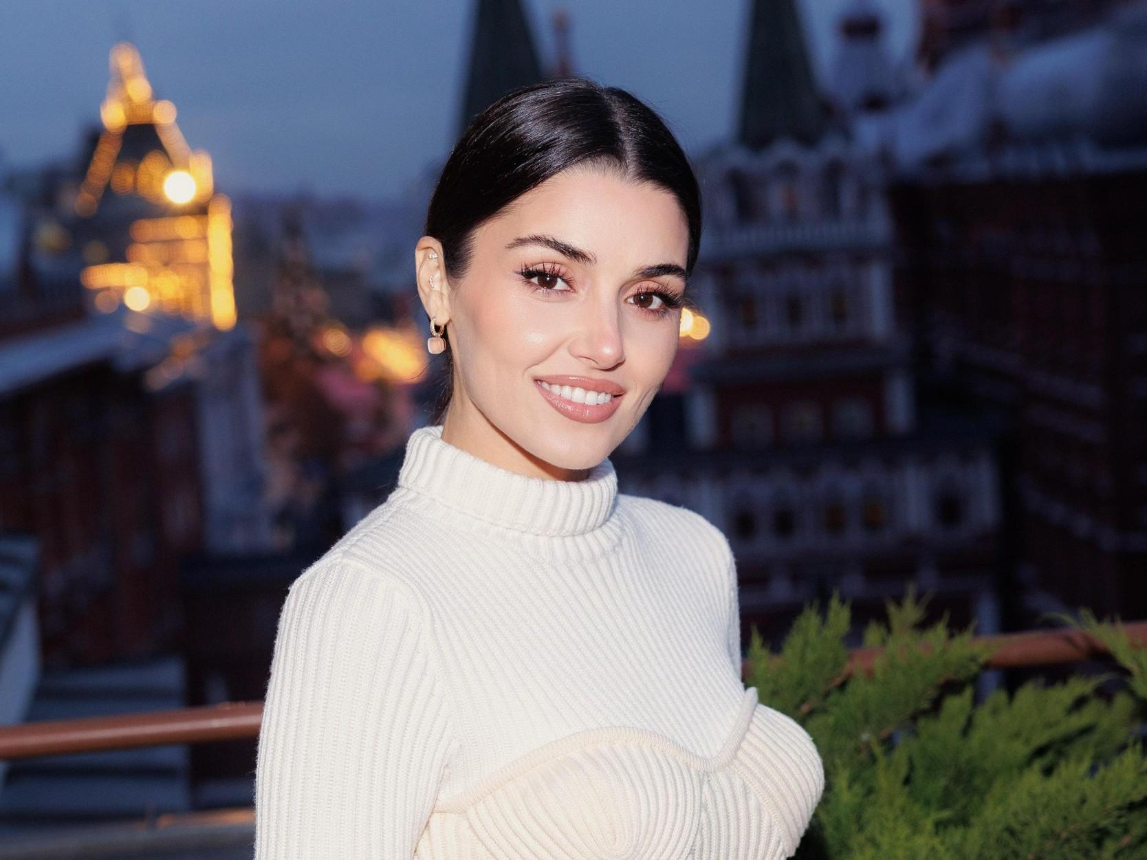 После прибытия в отель времени на отдых не было — Ханде ждало общение с прессой и фотосессия на террасе королевского люкса отеля Four Seasons Moscow. Она выбрала простой, но эффектный наряд: трикотажный комплект из водолазки и юбки. Верх был выполнен с объемным корсетным рельефом, напоминающим бюстье. Волосы актриса собрала в аккуратный хвост.