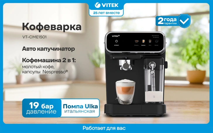 С чего начинается хороший день? С ароматной чашки кофе из кофеварки VITEK VT-CME1501, которая перенесет любимую кофейню к вам домой. Она приготовит нежный капучино с помощью автоматического капучинатора и насыщенный эспрессо с густой пенкой крема. Площадка для подогрева чашек сохранит температуру и аромат напитка до последнего глотка, а элегантный дизайн с подсветкой добавит уют самому раннему утру.