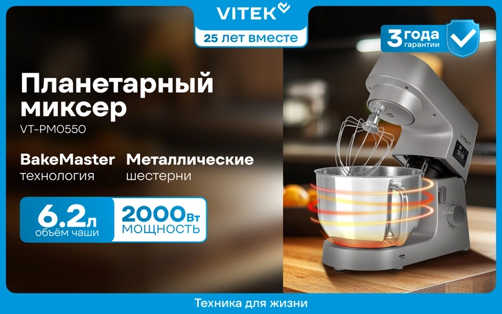 У планетарного миксера VITEK VT-PM0550 космическая мощность — 800 Вт. Он покоряет любую кондитерскую цель: от замеса плотного песочного теста до взбивания нежнейших сливок. С помощью трех насадок в комплекте — крюка для теста, венчика для взбивания и лопатки для смешивания можно легко испечь бисквит, зефир, меренгу и любую выпечку. Плюс к этому 5 скоростей, которые дают полную свободу творчества. С таким миксером даже многоярусный праздничный торт — не проблема.