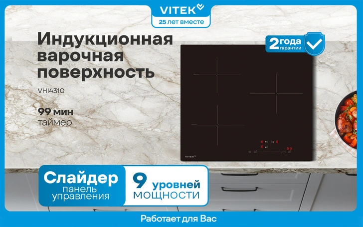 Индукционная варочная поверхность VITEK VHI4310 сочетает в себе стиль, безопасность и новые возможности для тех, кто любит готовить. Сенсорный слайдер позволяет в пару касаний задать температуру для любого блюда: от деликатного томления соуса для пасты до интенсивного приготовления наваристого бульона (вода закипает практически мгновенно). А функция блокировки панели обезопасит процесс от случайного нажатия, что особенно важно, когда дома есть дети.