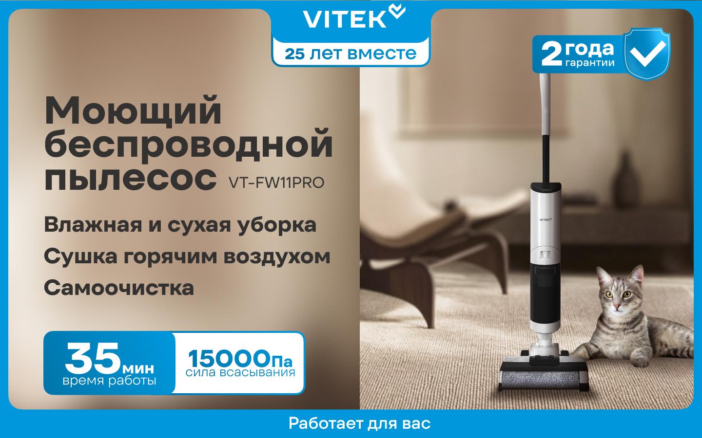 Моющий пылесос VITEK VT-FW11PRO превращает влажную уборку в удобную привычку. Он на раз-два справляется с пятнами на ковре и следами на полу, а благодаря складной конструкции — даже с пылью под диваном. Горячий воздух сушит насадку после уборки, не давая размножаться бактериям, а автономная работа до 35 минут и голосовые подсказки гарантируют, что ни одна зона не останется без внимания.