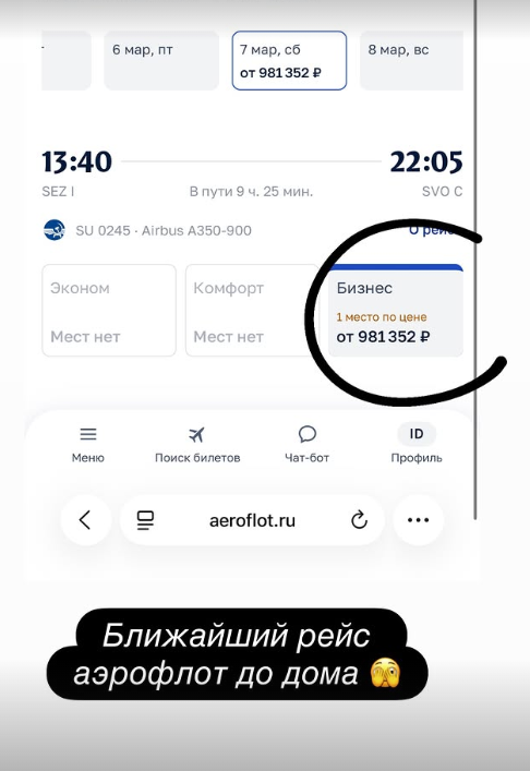 Звезда «Уральских пельменей» попробовала сама поискать билеты в Москву и нашла один, который стоит почти миллион рублей. Вылет запланирован лишь на 7 марта… Пока неизвестно, на сколько затянется отдых Дылдиной. Ранее артистка делилась деталями своего путешествия, подчеркивая, что очень счастлива побывать в этих местах.