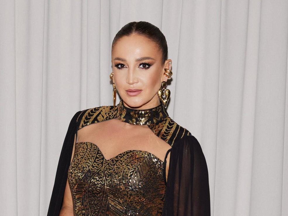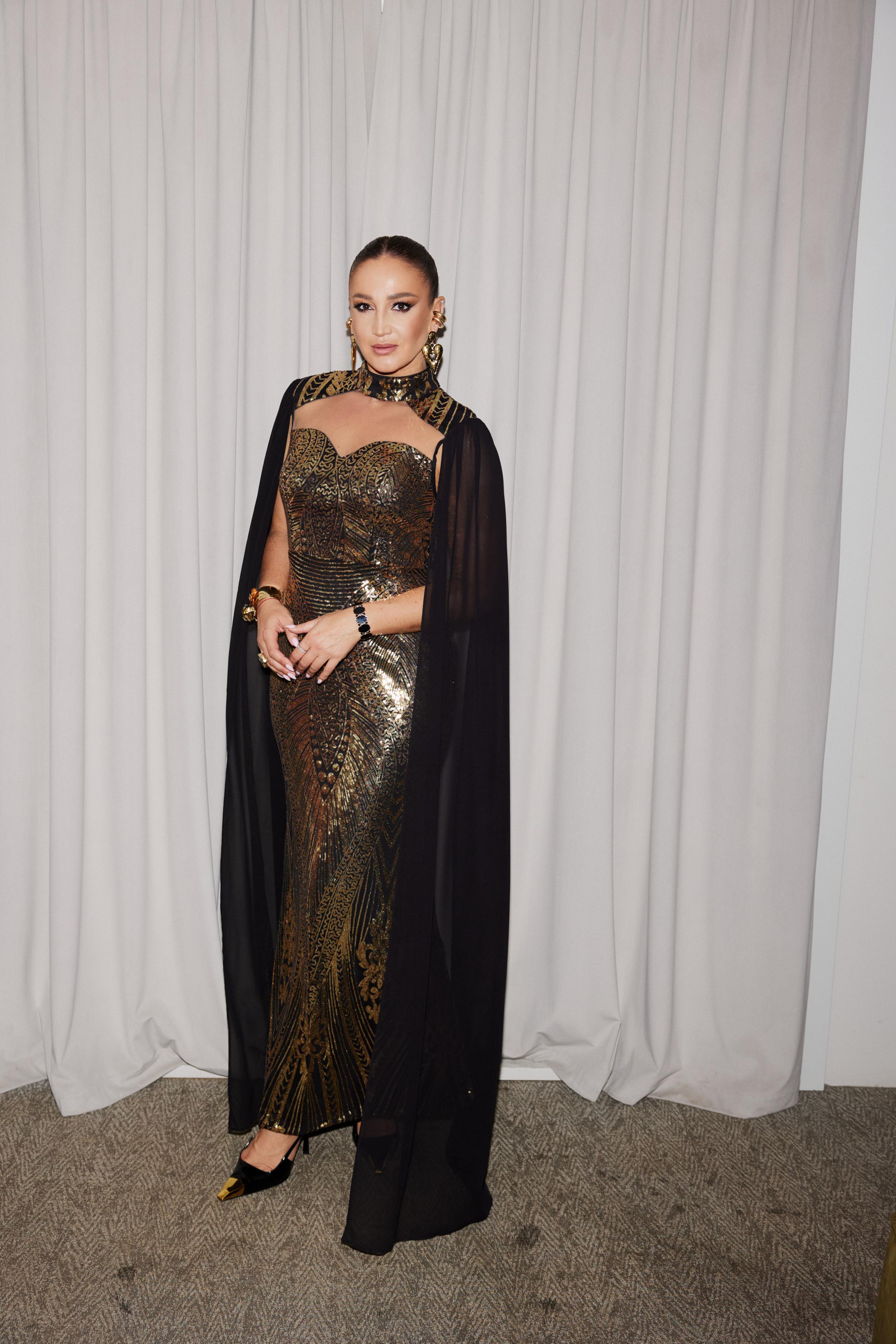 Главная героиня вечера надела длинное черное платье с прозрачными рукавами и шлейфом. Главный акцент — элементы в виде серебряных рук, обнимающих тело. После того, как Бузова встретила гостей, она отправилась менять образ.